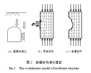 巖爆發(fā)生過程【27】可分為(a)垂直板裂化,(b)垂直板屈曲變形及(c)板變形增大破壞形成巖爆,見圖2巖爆過程。