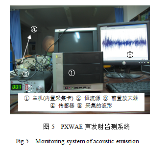 聲發(fā)射采用PXWAE檢測系統(tǒng),見圖5。該系統(tǒng)由主機(jī)(內(nèi)置采集卡,最高采樣速度為20MHz)、恒流源、前置放大器、聲發(fā)射傳感器組成。實驗時采樣率為1M,采用的聲發(fā)射傳感器探頭靈敏度為150kHz。