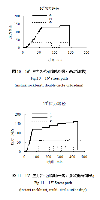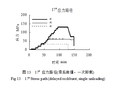 進(jìn)行了10件卸載巖爆實驗,巖爆特征有所不同,依據(jù)卸載到發(fā)生巖爆的時間可以將巖爆分為瞬時巖爆、標(biāo)準(zhǔn)巖爆及滯后巖爆,參見5.7花崗巖巖爆破壞進(jìn)程及巖爆類型。卸載巖爆實驗條件及結(jié)果列于表4。其中幾種典型的應(yīng)力路徑(應(yīng)力隨時間變化曲線)見圖8~13,瞬時巖爆有2#樣、19#樣為一次卸載、16#樣為兩次卸載和13#樣為多次卸載;5#樣為兩次卸載標(biāo)準(zhǔn)巖爆;17#樣為一次卸載滯后巖爆。