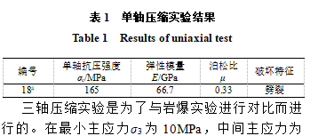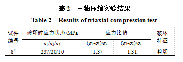 三軸壓縮實驗是為了與巖爆實驗進(jìn)行對比而進(jìn)行的。在最小主應(yīng)力σ3為10MPa,中間主應(yīng)力為20MPa時,最大主應(yīng)力達(dá)到237MPa時破壞,破壞形式為單面剪切,見表2。
