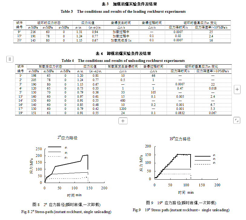 (3) 對某一試件,卸載后是否發(fā)生巖爆及何時發(fā)生巖爆與卸載前的應(yīng)力狀態(tài)及卸載后其應(yīng)力降速率有關(guān)。高應(yīng)力狀態(tài)及高應(yīng)力降速率的情況下易發(fā)生瞬時巖爆。