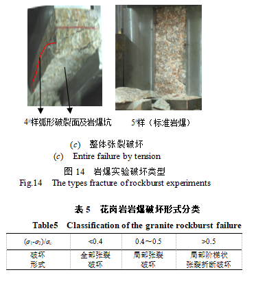(6) 從花崗巖發(fā)生巖爆后的破壞形式來看,可以分為局部片狀及顆粒彈射的張裂破壞、局部顆粒及片狀彈射的階梯狀劈裂折斷和片狀及顆粒彈射的整體劈裂破壞。