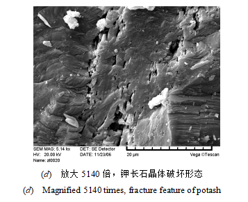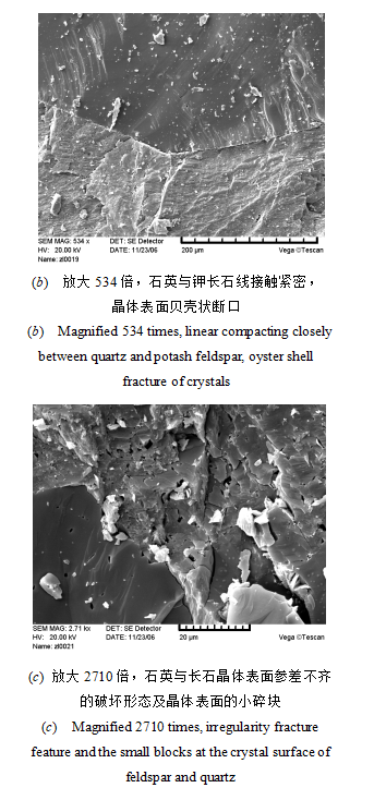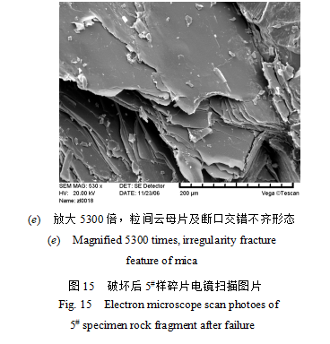 對破壞后的花崗巖碎塊進(jìn)行電鏡掃描發(fā)現(xiàn)石英與長石晶體呈緊密線接觸,從破裂面上可見石英及長石晶體斷裂,晶體間云母片折斷,晶體斷裂的斷口呈不平整的階梯狀。見圖15破壞后5#花崗巖碎片電鏡掃描不同放大倍數(shù)下的(a)至(e)圖片。(a)放大100倍的電鏡掃描圖片全貌,致密,表面凸凹不平,不同礦物晶體緊密接觸。(b)為局部放大534倍后的石英與長石晶體緊密線接觸情況,并可見石英與長石斷裂的階梯形端口,晶體表面有小碎屑分布。(c)為局部放大2710倍時石英表面的斷口及長石晶體的參差不齊破壞狀態(tài)。(d)為放大5140倍之后更清晰的長石晶體斷裂形態(tài)。(e)為放大5300倍的粒間云母片及交錯不齊的斷裂形態(tài)。