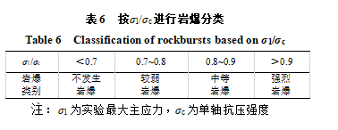 發(fā)生巖爆試件的σ1/σc值與其巖爆類型有一定的相關(guān)性。在所實驗的花崗巖試件中,該比值σ1/σc≥0.73時發(fā)生了不同類型的巖爆:滯后巖爆、標(biāo)準(zhǔn)巖爆或瞬時巖爆。表6列出了按σ1/σc進(jìn)行的花崗巖巖爆分類。最大主應(yīng)力值對應(yīng)著巖爆發(fā)生的深度(在不考慮構(gòu)造應(yīng)力或其它因素的影響下)。在淺部應(yīng)力較低的條件下,不發(fā)生巖爆;到達(dá)一定深度后,開挖引起的切向應(yīng)力與巖石長期強(qiáng)度相當(dāng)時,σ1/σc=0.7~0.8時發(fā)生較弱巖爆;隨著應(yīng)力的增加,當(dāng)最大主應(yīng)力與巖石單軸抗壓強(qiáng)度σ1/σc=0.8~0.9時,發(fā)生中等強(qiáng)度巖爆;當(dāng)最大主應(yīng)力與單軸抗壓強(qiáng)度之比大于0.9時發(fā)生強(qiáng)烈?guī)r爆。