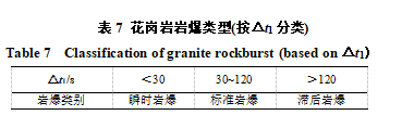 目前千米深度范圍內(nèi)巷道等地下工程開挖后,受巖性結(jié)構(gòu)、應(yīng)力狀態(tài)及工程擾動等因素的作用影響,并不一定立即發(fā)生巖爆。根據(jù)在實驗室內(nèi)卸載后至發(fā)生巖爆的時間△t1不同,可以將巖爆類型分為瞬時巖爆、標(biāo)準(zhǔn)巖爆及滯后巖爆,見表7。