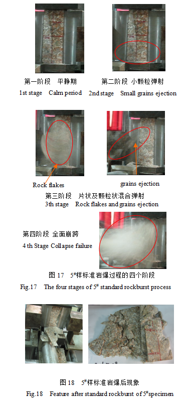 5#樣在兩次循環(huán)卸載后33s發(fā)生了巖爆,其進(jìn)程可明顯地分為開始的平靜期、之后的顆粒狀的彈射、片狀剝離伴隨著顆?;旌蠌椛浼白詈蟮娜姹揽?;17#樣在單次卸載后20分鐘時發(fā)生巖爆,表現(xiàn)為滯后性,在卸載至發(fā)生巖爆前,巖石損傷不斷加劇,伴隨著應(yīng)力的降低。