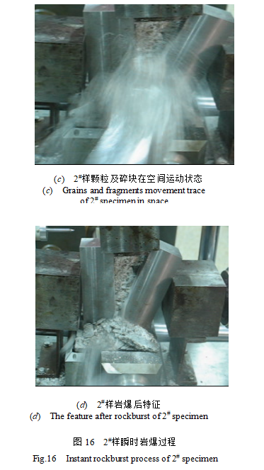 (3) 花崗巖在三向應(yīng)力狀態(tài)下,快速卸載水平一向的應(yīng)力后,從卸載至發(fā)生巖爆時間為卸載后立即發(fā)生巖爆及卸載后20分鐘才發(fā)生巖爆,表現(xiàn)為明顯的瞬時性、滯后性及介于兩者之間狀態(tài)的標(biāo)準(zhǔn)性。從實驗發(fā)生的現(xiàn)象看,巖爆過程可分為平靜期、小顆粒彈射、片狀剝離伴隨著顆粒混合彈射及最后的全面崩垮四個階段,該過程歷時時間長短不等,最快為0.1s,最慢的為105s。從應(yīng)力路徑可以看出,2#樣卸載后的應(yīng)力差較高,卸載后0.5s立即發(fā)生巖爆破壞,表現(xiàn)為巖爆瞬時性特征,19#樣、16#樣、13#樣卸載后也都很快發(fā)生巖爆破壞,分別在一次卸載后24s、兩次循環(huán)卸載后10s及多次循環(huán)卸載(6次)后15s時間時發(fā)生了巖爆。