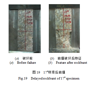 (1)滯后巖爆是指卸載后發(fā)生巖爆時間比標(biāo)準(zhǔn)巖爆更長。發(fā)生滯后巖爆有兩種情況,一是巖體在一定載荷作用下,隨著時間的增加,受長期強(qiáng)度控制下具備巖爆發(fā)生條件時,二是地下巖體卸載后應(yīng)力重分布達(dá)到新的平衡狀態(tài)過程中,發(fā)生的巖爆破壞。滯后巖爆的室內(nèi)實現(xiàn)可以在三向應(yīng)力狀態(tài)下,最大主應(yīng)力小于巖石的單軸抗壓強(qiáng)度時進(jìn)行卸載巖爆實驗或加載巖爆實驗,一般卸載后需要較長時間才發(fā)生巖爆,即滯后巖爆。大量蠕變實驗表明【28】,巖體的長期強(qiáng)度低于單軸抗壓強(qiáng)度,并且隨著時間的增加,長期強(qiáng)度降低。圖19是17#樣滯后巖爆的卸載后破壞前及巖爆后特征,卸載后在開始5分鐘內(nèi)可以聽到試件的聲音,表明裂紋開裂,巖石損傷加劇。5~20分鐘為平靜期,但試件內(nèi)的應(yīng)力在調(diào)整過程中,形成局部最后的劣化破壞區(qū),20分鐘時突然巖爆,顆粒及小碎塊彈射。