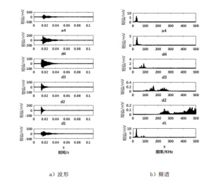 采用小波變換的方法將斷鉛聲發(fā)射原始信號(hào)分解為不同頻率段,聯(lián)合不同頻率段的時(shí)域波形與頻譜對(duì)應(yīng)分析,能夠?qū)崿F(xiàn)將斷鉛聲發(fā)射信號(hào)與接觸摩擦信號(hào)分離,提取出包含更多斷鉛聲發(fā)射信息的信號(hào),對(duì)進(jìn)一步提取斷鉛聲發(fā)射特征排除了更多干擾信號(hào),能夠提高提取的特征值的準(zhǔn)確性。