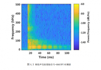 如圖 4.3 為斷鉛聲發(fā)射原始信號(hào)-056STFT 時(shí)頻譜,可以看出信號(hào)頻率沿時(shí)間軸分為三個(gè)階梯。第一階梯為高頻段(200-500KHz)主要出現(xiàn)在原始信號(hào)的初始時(shí)刻,該時(shí)刻鉛筆芯還未斷裂,主要發(fā)生了接觸摩擦,從這里可以看出 d1、d2 為接觸摩擦信號(hào)的準(zhǔn)確性。第二階梯 50-110KHz,鉛筆芯斷裂時(shí)刻開始以斷鉛聲發(fā)射信號(hào)為主,可以看出 d4 主要為斷鉛聲發(fā)射信號(hào)的準(zhǔn)確性。第三階梯,為低頻段 10-40KHz 左右持續(xù)時(shí)間很長(zhǎng)符合斷鉛聲發(fā)射信號(hào)衰減的過程,是斷鉛信號(hào)。如圖 4.3 為斷鉛聲發(fā)射原始信號(hào)-056STFT 時(shí)頻譜,可以看出信號(hào)頻率沿時(shí)間軸分為三個(gè)階梯。第一階梯為高頻段(200-500KHz)主要出現(xiàn)在原始信號(hào)的初始時(shí)刻,該時(shí)刻鉛筆芯還未斷裂,主要發(fā)生了接觸摩擦,從這里可以看出 d1、d2 為接觸摩擦信號(hào)的準(zhǔn)確性。第二階梯 50-110KHz,鉛筆芯斷裂時(shí)刻開始以斷鉛聲發(fā)射信號(hào)為主,可以看出 d4 主要為斷鉛聲發(fā)射信號(hào)的準(zhǔn)確性。第三階梯,為低頻段 10-40KHz 左右持續(xù)時(shí)間很長(zhǎng)符合斷鉛聲發(fā)射信號(hào)衰減的過程,是斷鉛信號(hào)。