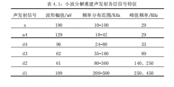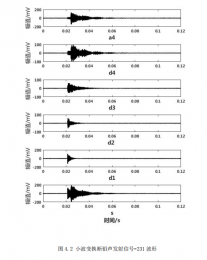 聲發(fā)射傳感器 30mm 處采集的斷鉛信號(hào)-231 經(jīng)小波分解與重構(gòu)后信號(hào)的波形與頻譜如圖 4.1、4.2,4.3。從圖 4.2 中 s(原始信號(hào)的頻譜)可以看出斷鉛聲發(fā)射信號(hào)的頻率主要集中在 10-100KHz 之間,頻率峰值為 29KHz。圖 4.1 中 d1 信號(hào)波形幅值109mV,頻率主要分布在 200-500KHz,峰頻 250KHz、450 KHz;d2信號(hào)波形幅值 61mV,頻率主要分布在 80-360KHz,峰頻140KHz、250 KHz;d3信號(hào)波形幅值 62mV,頻率主要分布在 35-180KHz,峰頻 89KHz;d4 信號(hào)波形幅值96mV,頻率主要分布在 24-80KHz,峰頻33KHz;a4 信號(hào)波形幅值 129mV,頻率主要分布在 10-42KHz,峰頻 29KHz。